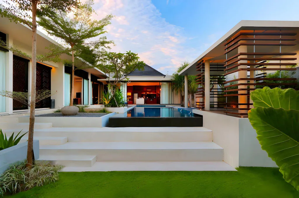 Penciptaan taman, kolam renang, dan area outdoor bernuansa resort.